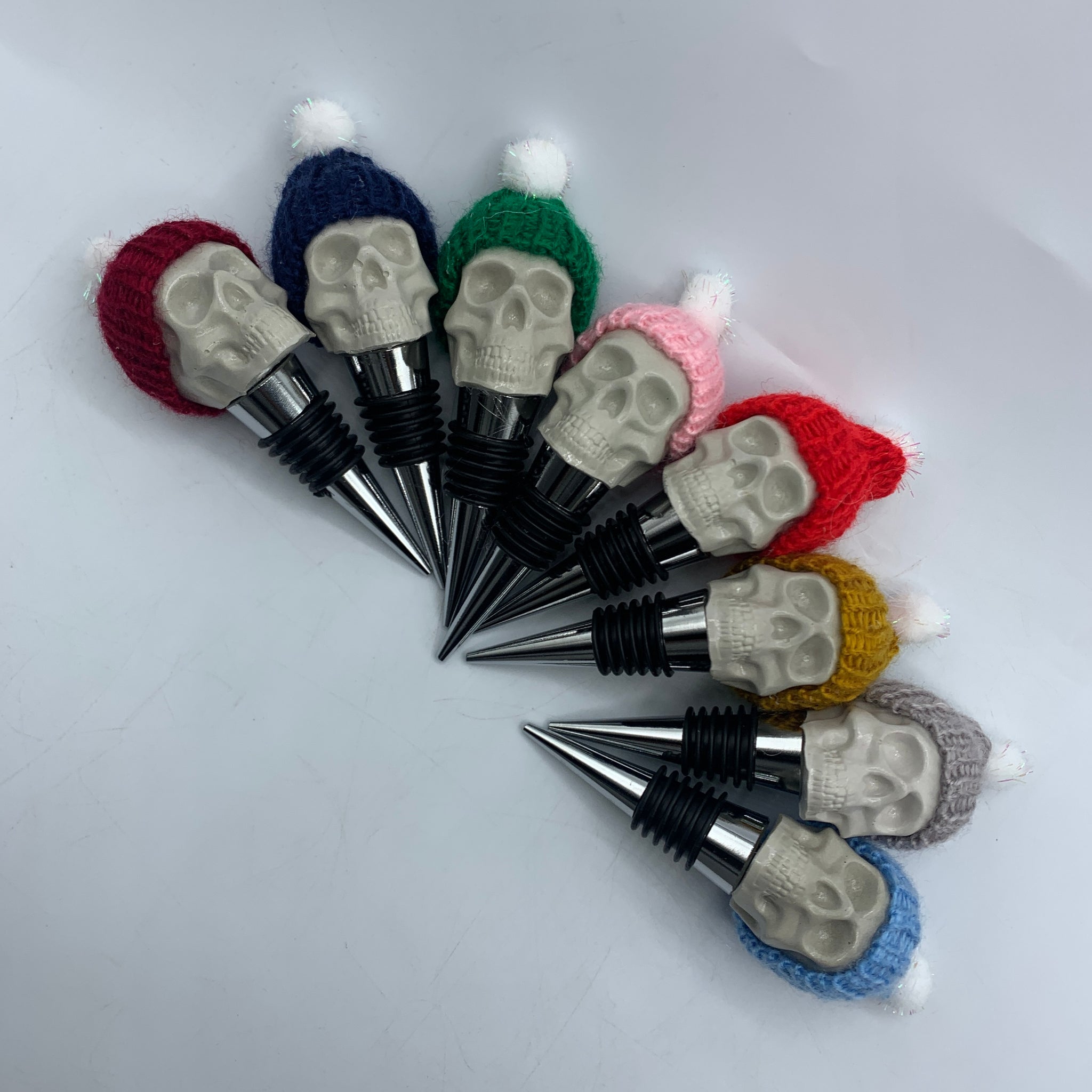 Plug, protect, and seal your favorite bottles with this unique skull wine stopper topped with the cutest, coziest winter hat.