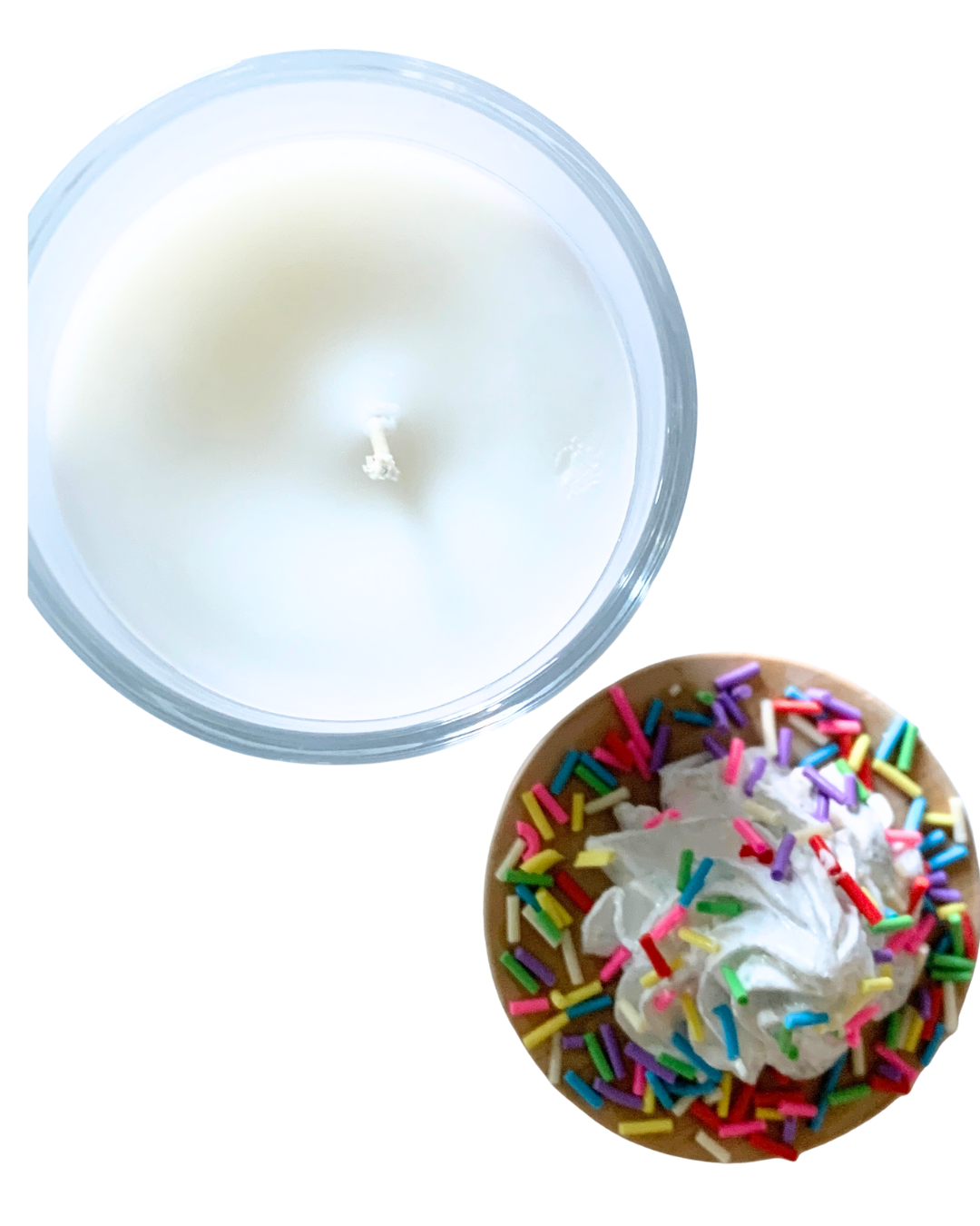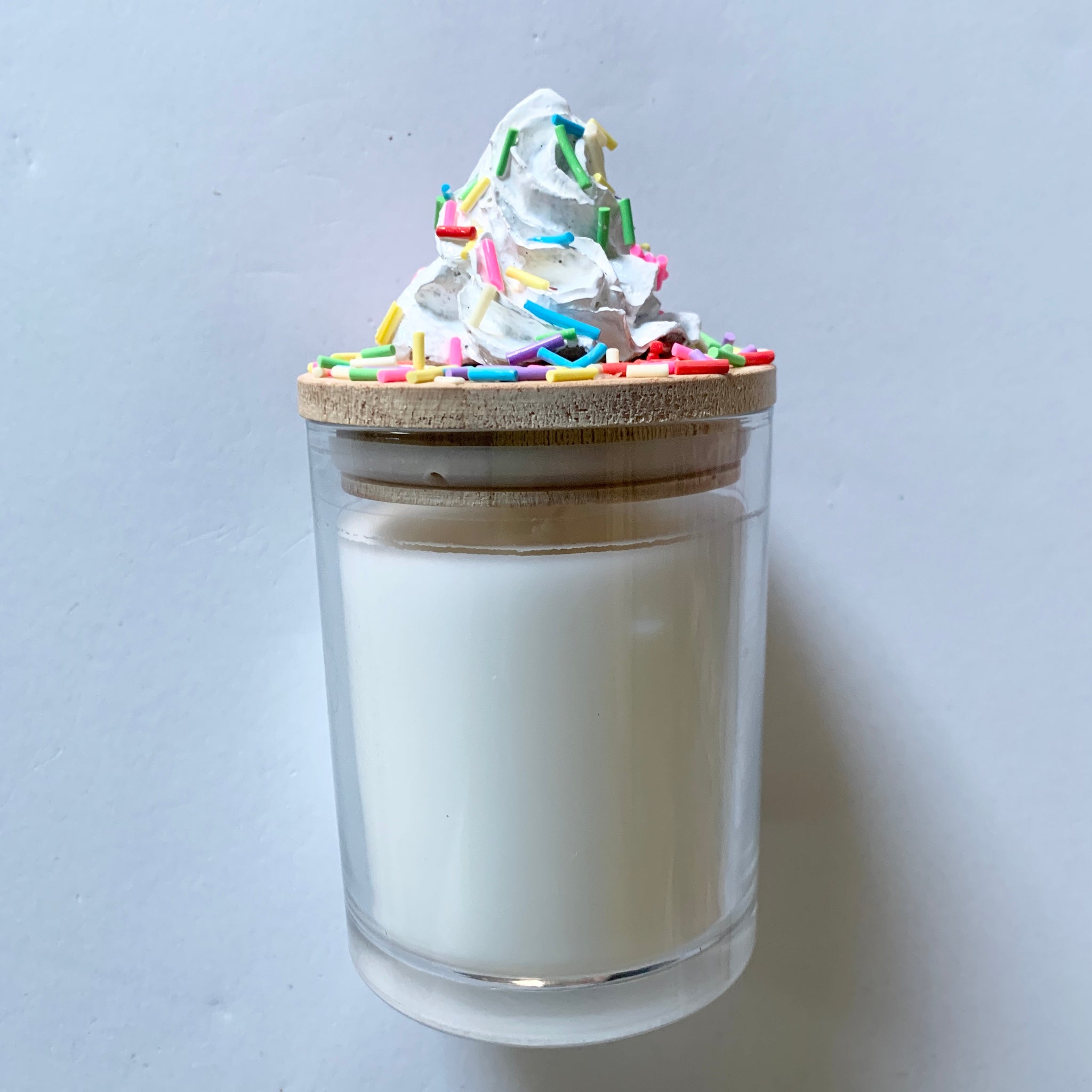 Bring a little sweet-inspired charm into your space with these one-of-a-kind glass jars. Each jar is topped with a concrete dollop of whipped cream and sprinkles and filled with a coconut, soy wax candle (your choice of scented or unscented.)