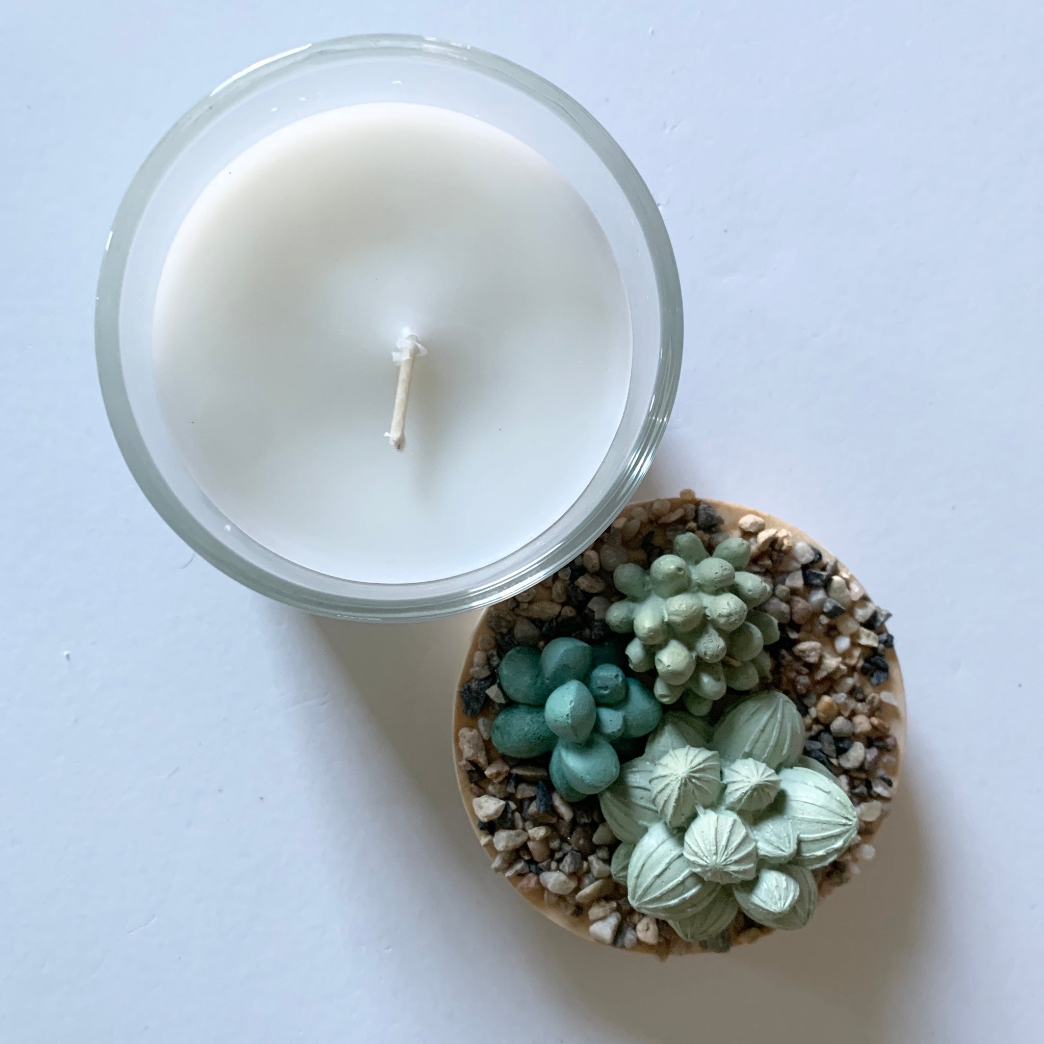 Bring a little greenery-inspired charm into your space with these one-of-a-kind glass jars. Each jar is topped with handmade concrete succulents and finished with natural rocks for a realistic, garden-like look and filled with a coconut, soy wax candle (your choice of scented or unscented.)